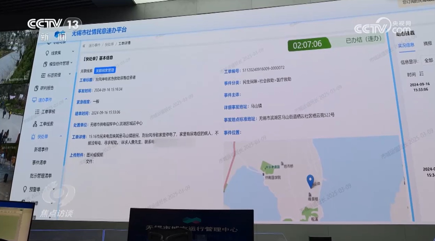 去年9月臺風“貝碧嘉”過境期間,無錫全市遭遇了停電。一位需要在家做腎透析的病人給12345熱線撥打了求助電話。當時,城運中心接到的市民訴求量正在激增,而人工智能敏銳地捕捉到了這條信息中的關鍵詞。根據這份工單的處理時間,接訴一小時之內,市供電指揮中心緊急為病人送去了應急的供電設備。