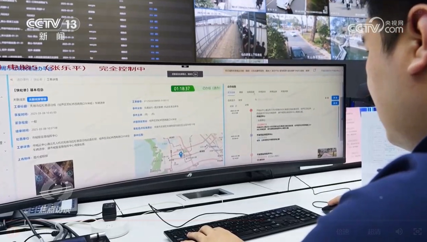 在無錫市城市管理局,2025無錫馬拉松開賽前,城管指揮中心正在向無錫市城市運行管理中心申請使用無人機對沿線市容問題進行飛行檢查。