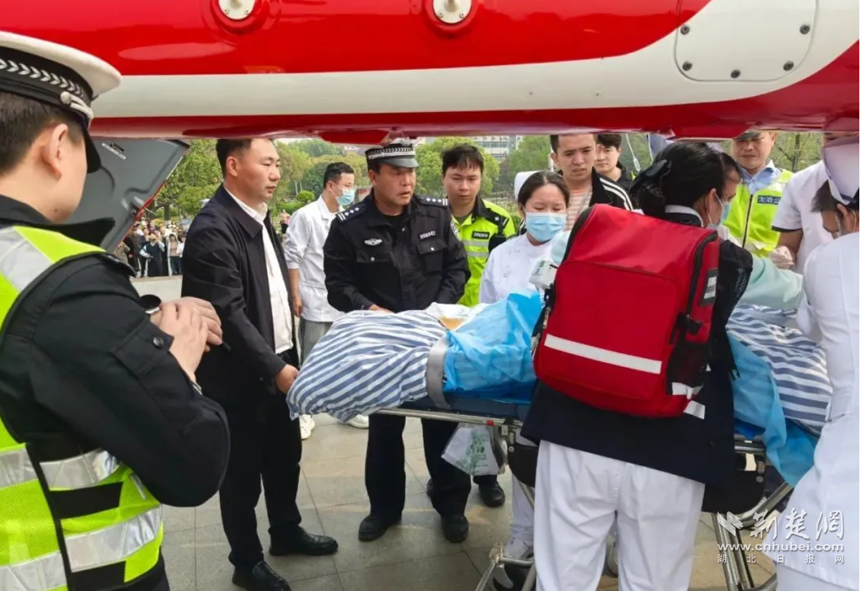 上午9時46分,伴隨著螺旋槳的陣陣轟鳴,來自武漢亞心總醫院的空中救援團隊的急救直升機穩穩降落在大冶市青銅文化廣場臨時搭建的“停機坪”上。武漢專家迅速奔赴大冶市中醫醫院急診科,在傷者床邊再次細致評估病情,確認其符合轉運條件。