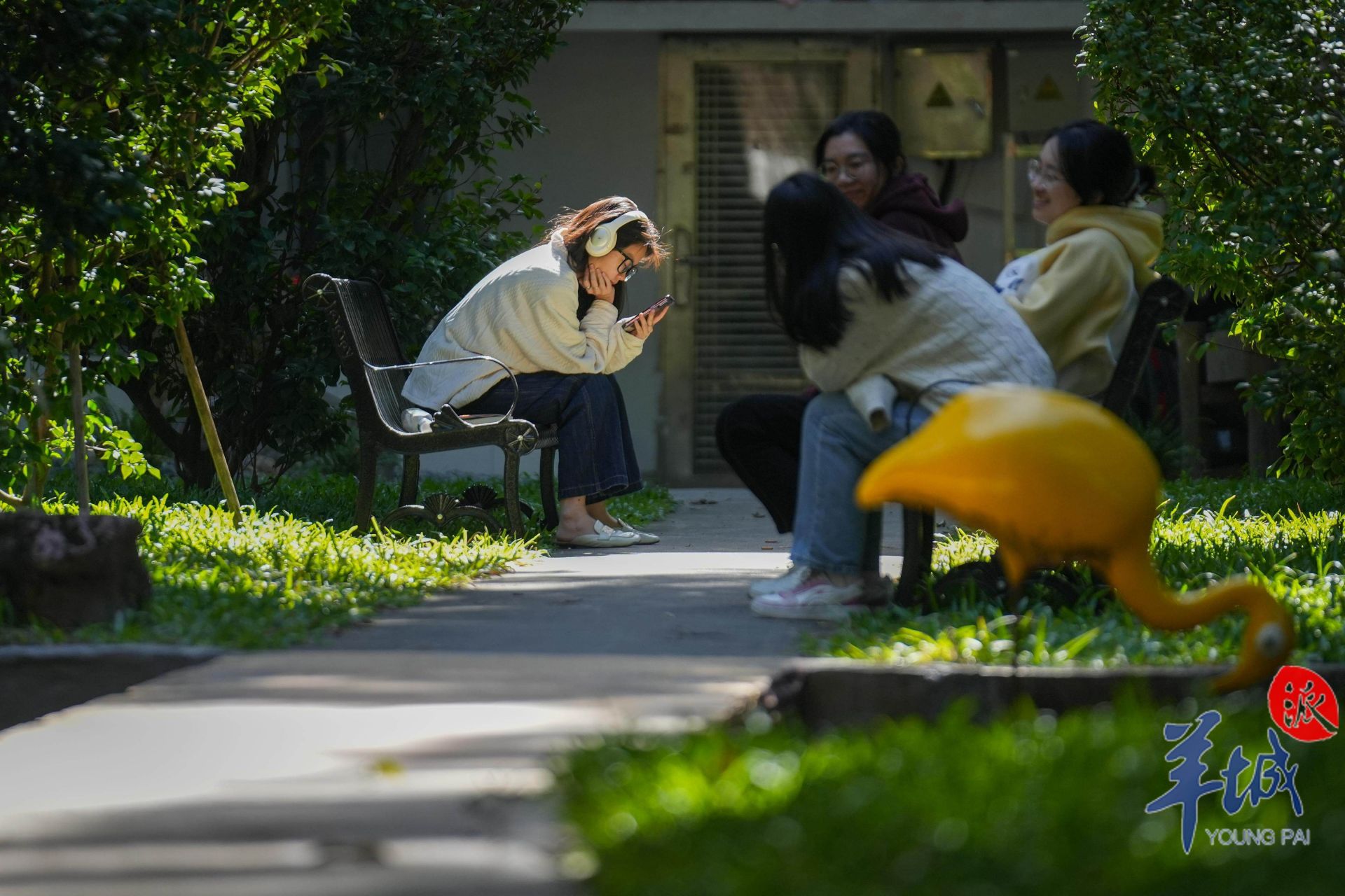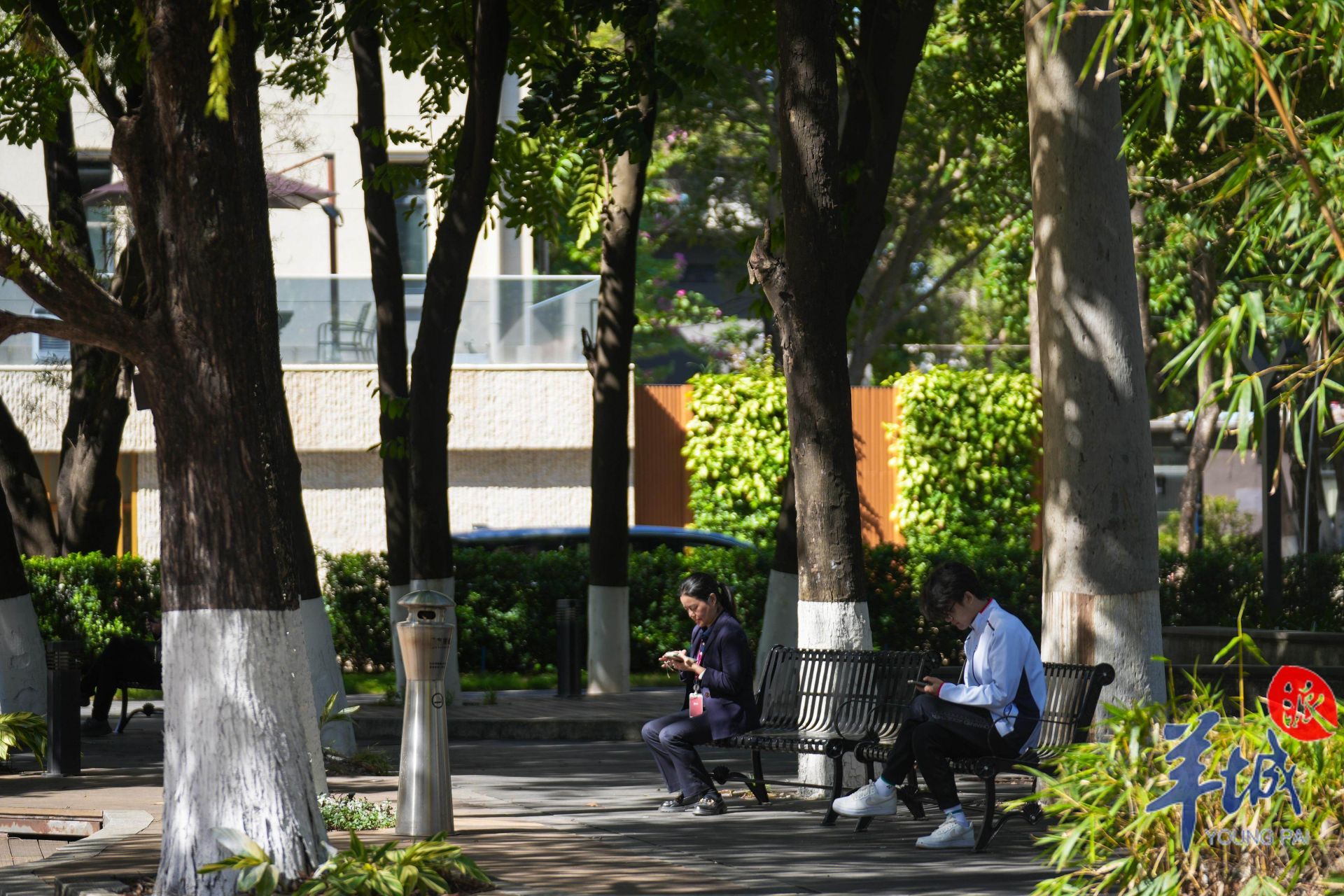 企業員工與游客喜歡坐在樹下享受歲月靜好。羊城晚報記者 梁喻 攝