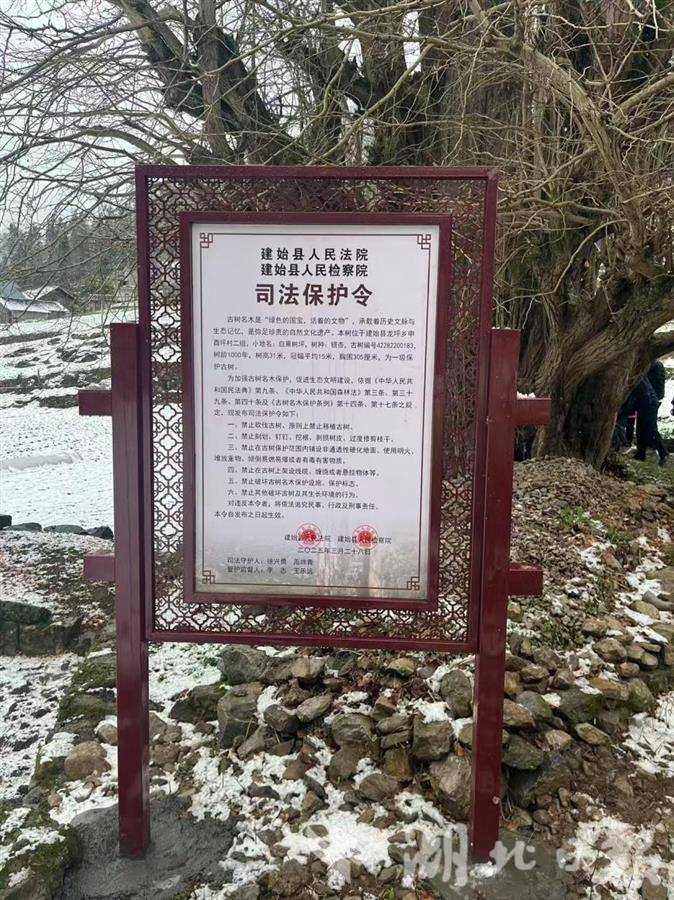 湖北日報訊(記者汪訓前、通訊員龔星鑫、周銀屏、李雨瑤)3月28日,建始縣人民法院、縣人民檢察院聯合縣林業局、龍坪鄉政府,為一株千年銀杏樹發布司法保護令,撐開古樹名木“法治保護傘”。