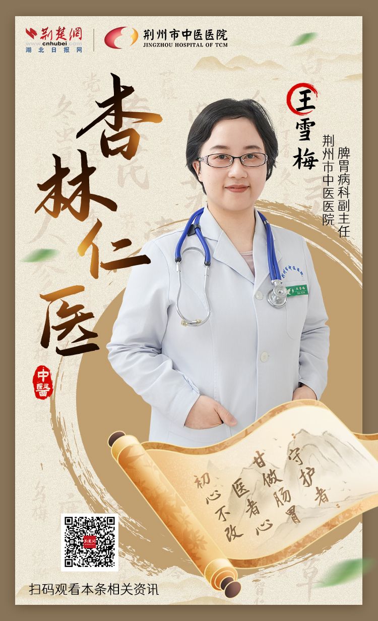王雪梅:荊州市中醫(yī)醫(yī)院脾胃病科副主任,副主任醫(yī)師,碩士研究生導師,湖北省時珍人才工程省級中醫(yī)藥優(yōu)秀青年人才。主持及參與省市級課題多項,發(fā)表文章10余篇,專著2本,獲湖北省中醫(yī)藥科技進步三等獎2項,荊州市科技進步三等獎1項。師從第六批全國名老中醫(yī)藥傳承指導老師嚴光俊教授、長江學者兼湖北中醫(yī)藥大學校長呂文亮教授。