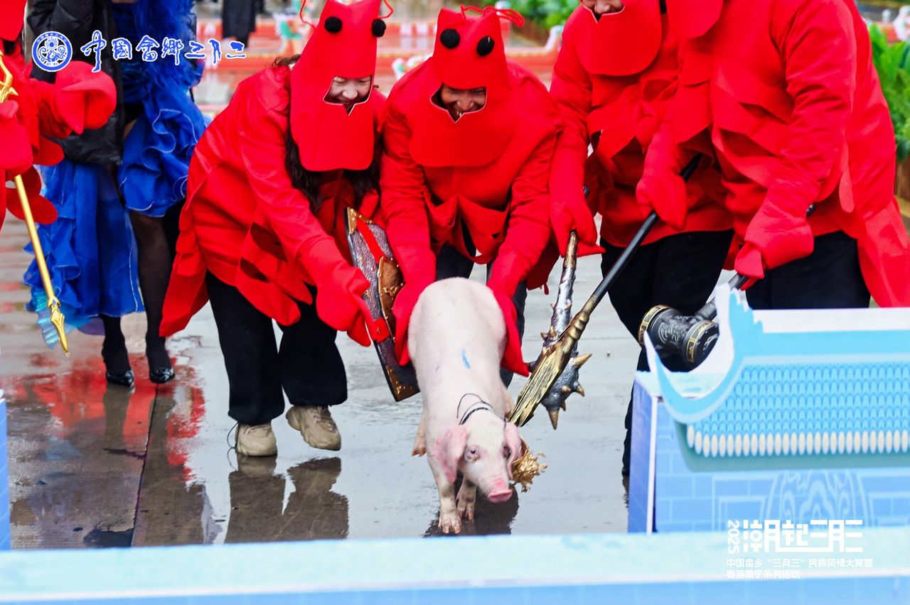 當天下午,歡脫的趕豬大賽成為全場關注的焦點。21個鄉鎮(街道)派出特色戰隊,拿出看家本領進行趕豬競速。明星、主播、自媒體達人紛紛加入趕豬隊伍,圍觀游客加油吶喊,將小眾賽道活脫脫變成大眾狂歡。