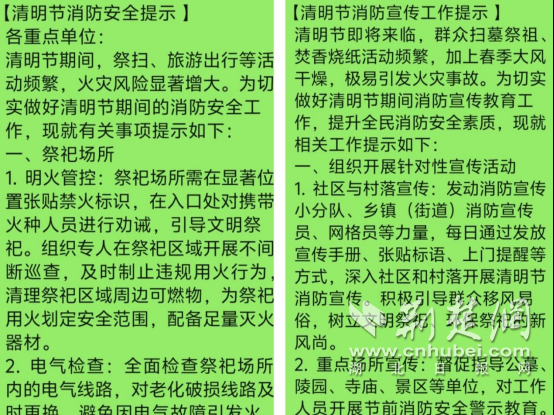 此外,荊州區消防救援大隊還通過微信群向200余家重點單位及各部門發送消防安全工作提示。提示內容涵蓋清明節期間火災防范要點、應急處置方法等知識,要求各單位認真開展消防安全自查自糾,加強對員工的消防安全教育,確保一旦發生火災,能夠迅速有效處置。此舉極大地提高了重點單位和相關部門對清明節期間消防安全工作的重視程度,營造了濃厚的消防安全宣傳氛圍。
