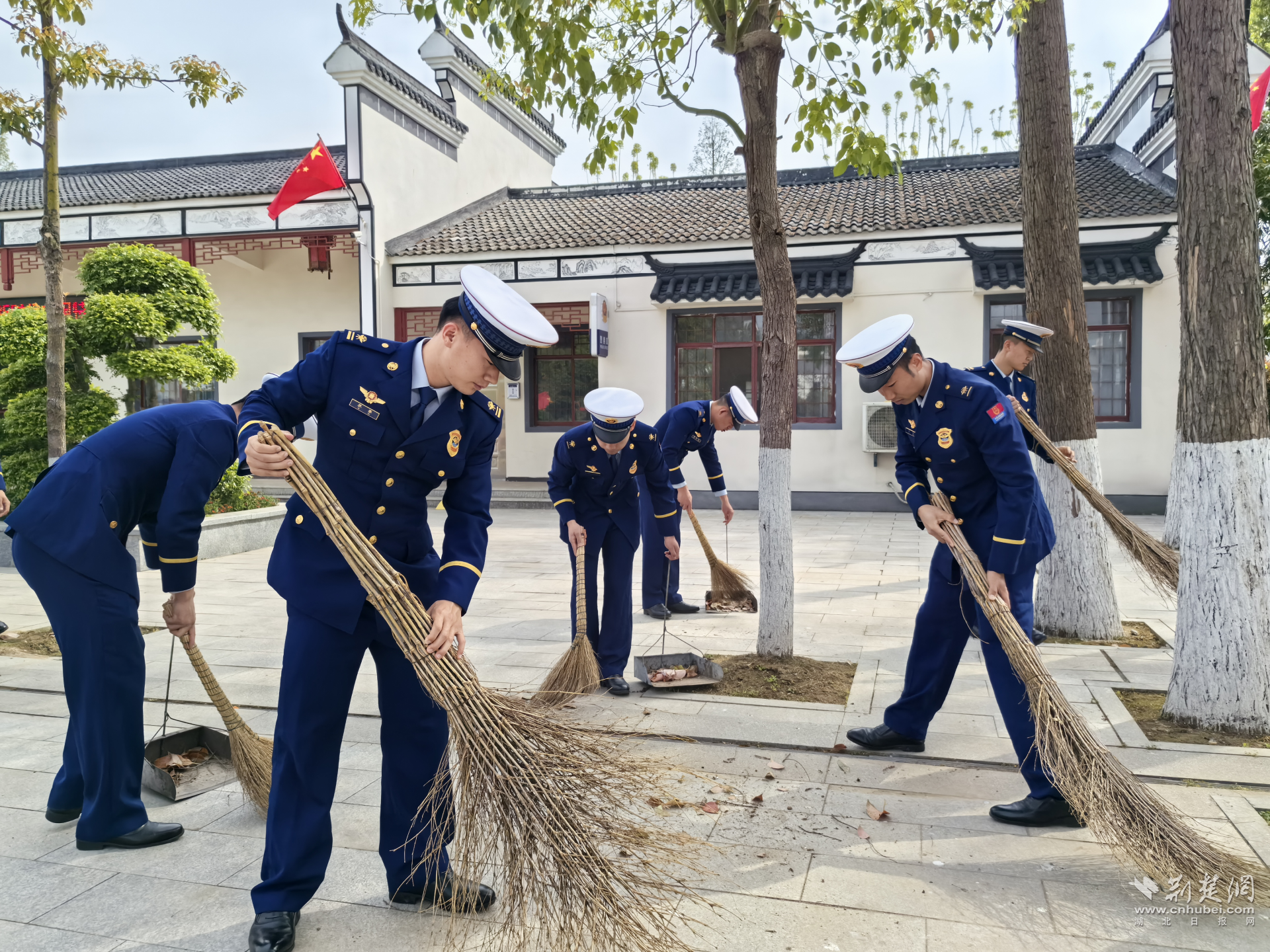 在莊嚴的紀念碑前,全體人員重溫入黨誓詞,并緩步繞行瞻仰烈士紀念碑,向革命烈士敬獻鮮花,以無聲行動表達對英雄的深切追思。指戰員們拿起提前準備好的掃帚、抹布等工具,自發清理著陵園的樹葉,擦拭著革命烈士們的墓碑,表達對革命先烈的敬意。