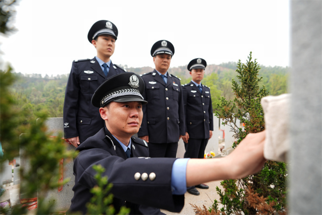 這是鄂靖第一次穿著警服來給父親掃墓,胸前的警號“032078”熠熠生輝,他忍住心中的悲痛向父親的墓碑鄭重地敬了一個(gè)禮。2024年9月,鄂靖重啟了父親的警號“032078”,并主動(dòng)申請到父親生前工作的社區(qū)崗位。此刻,他在墓前向父親匯報(bào)參警半年來的點(diǎn)滴成長,承諾繼續(xù)走完父親未走完的路。