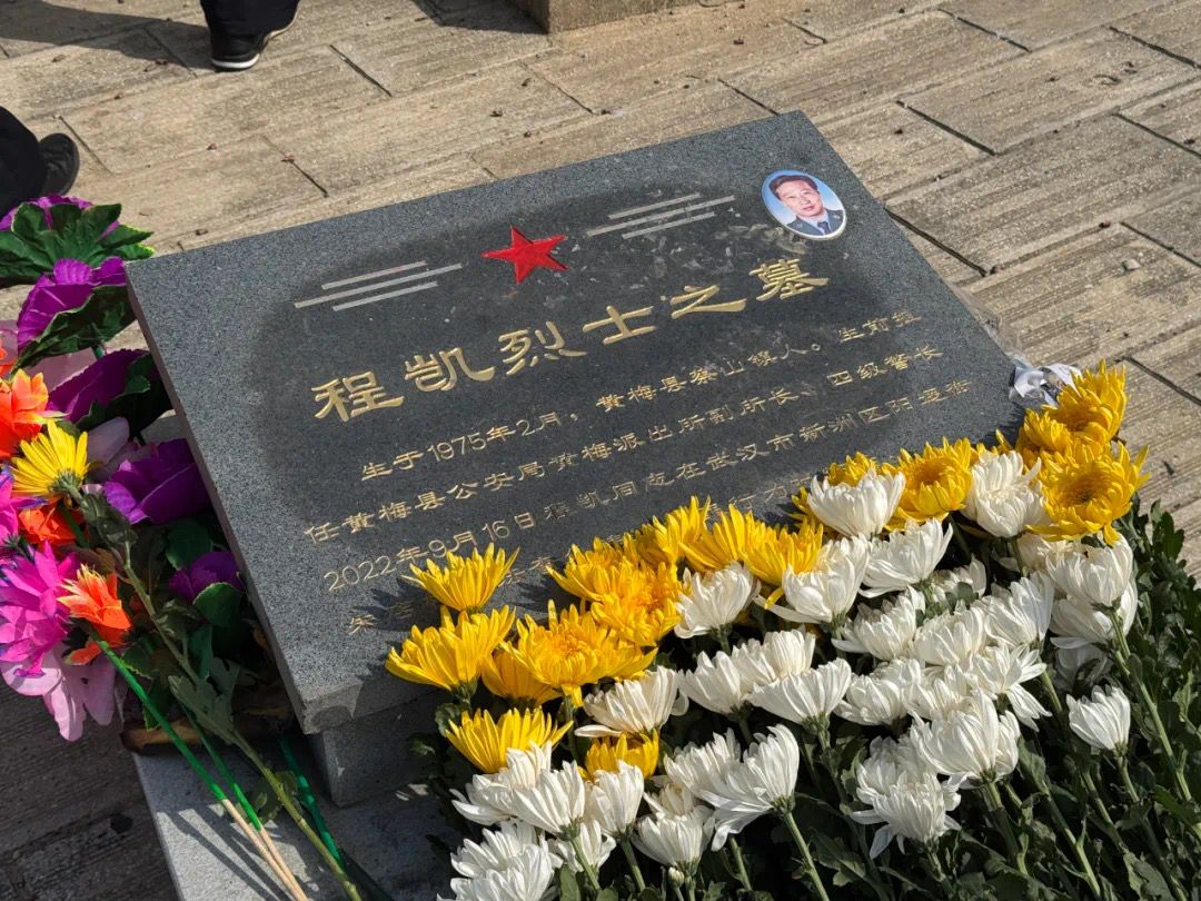 2022年9月16日8時許,時任黃梅縣公安局黃梅派出所副所長的程凱,在駕車攔截嫌疑人時,所駕車輛失控,翻向路邊陡坎。生死瞬間,程凱拼盡全身力氣,將身邊戰友一把推開,自己卻連同側翻車輛一起跌下陡坎,被重重壓在車身之下,不幸壯烈犧牲,年僅47歲。后來,他被追授為全國公安系統二級英雄模范。