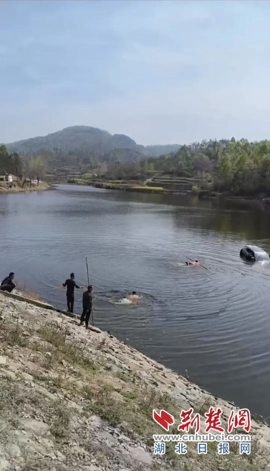 正在水庫旁邊田里鋤草的村民沈正前立即騎上摩托車奔到事發(fā)地點(diǎn),脫下衣服,跳下水向落水車輛游去。