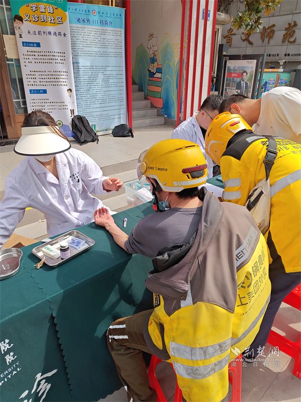 活動當天,社區新時代文明實踐站內人頭攢動。義診區內,來自湖北省人民醫院的專家團隊為社區居民、轄區新就業群體提供免費疾病篩查與健康咨詢服務。專家們耐心詢問病史、細致檢查身體,幫助及早發現健康隱患,并針對性地給出健康建議。“平時工作忙,很少去醫院體檢,這次專家來到家門口,既方便又專業,真是太貼心了。”外賣小哥張師傅表示。