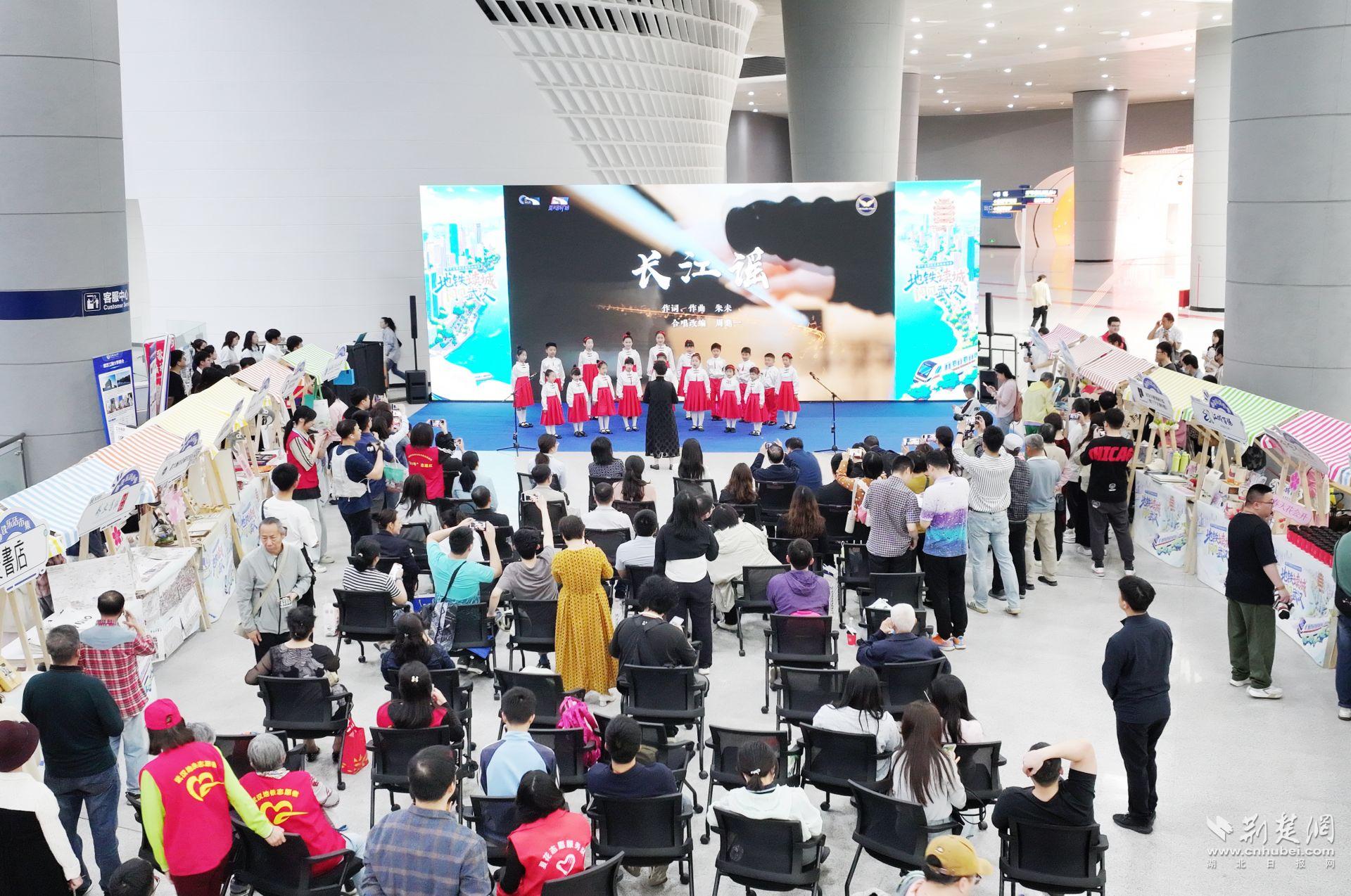 “我是武漢伢,長江是我家。熱干面飄香,古琴聲悠揚,小時候的童謠還在唱……”來自湖北少兒廣播合唱團的孩子們攜原創歌曲《長江謠》首次登上地鐵舞臺,伴隨著江漢關、漢陽門、武漢馬拉松的畫面閃現,長江的“一江碧水、兩岸風華”躍然眼前,充滿童真的唱誦聲在地鐵站內回蕩。