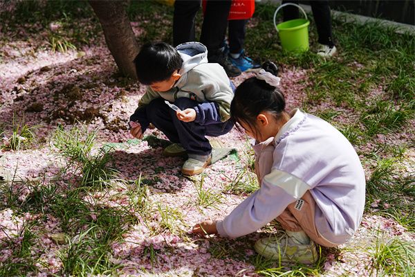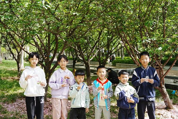 櫻花書簽制作環節,孩子們仔細收集飄落的櫻花花瓣,并發揮奇思妙想,將收集的花瓣剪裁拼貼,制作成一個個精美的櫻花書簽。這些獨一無二的書簽不僅留住了春天的美好,更在孩子們心中播下了環保的種子。