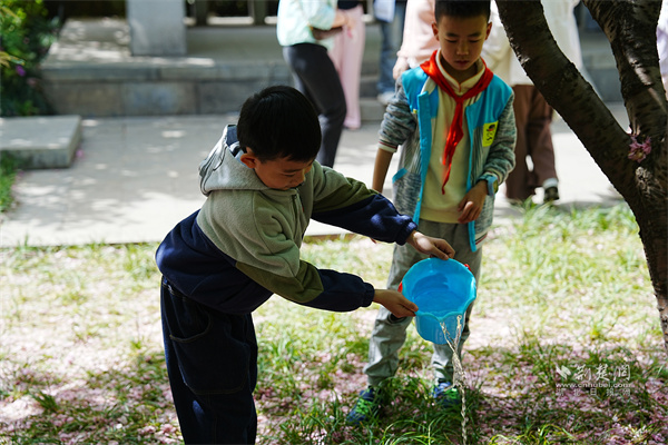 在實踐環節,親子家庭為自己認養的櫻花樹進行澆水養護。“澆水要澆在樹根周圍,像給小樹畫個圓圈。”孩子們手持小水桶,為樹木送去“生命之水”,家長們則化身“助教”,一邊協助孩子完成養護任務,一邊分享養護小技巧,現場一片熱火朝天的勞動景象。