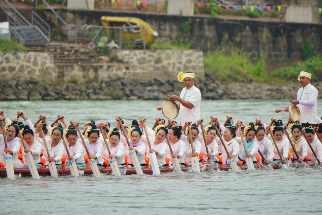 4月13日,在西雙版納傣族自治州景洪市,人們參與傳統龍舟表演賽。 新華社記者 高詠薇 攝