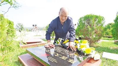在谷城縣烈士陵園,陳文生輕輕擦著小爺爺陳西文的墓碑。通訊員供圖
