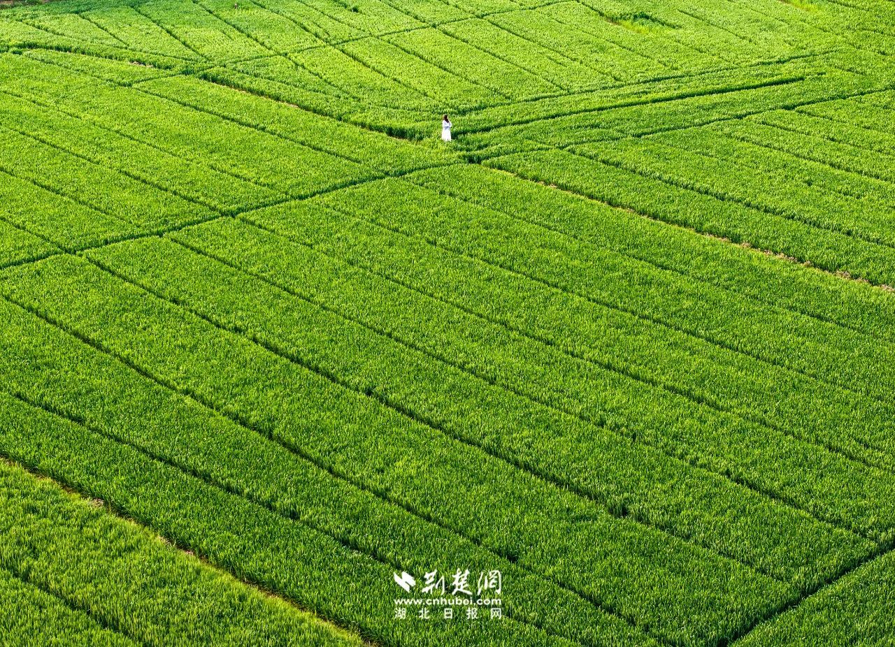 鳥瞰楊橋村的麥田,綠色麥浪春意無限。荊楚網(wǎng)記者 劉建維/攝
