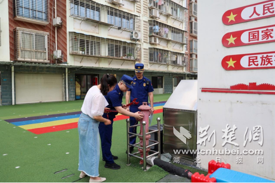 消防監督員對幼兒園教學樓室外消防設施進行抽查。 通訊員 供圖