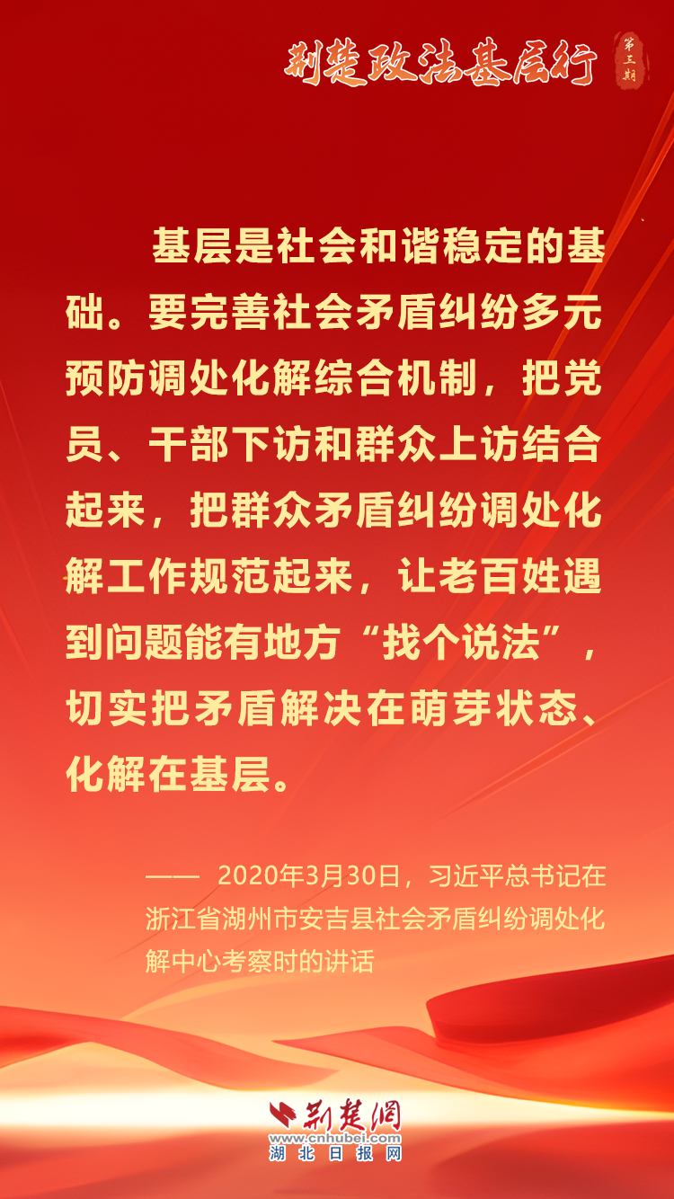 民生無小事,枝葉總關(guān)情。在今年3月中央政法委舉行推進社會治安綜合治理中心規(guī)范化建設(shè)現(xiàn)場會之際,“荊楚政法基層行”第三期于3月26日啟動,以“聚力建支點 解紛在一線”為主題,前往襄陽、隨州等10個市州,走進綜治中心、社區(qū)、鄉(xiāng)村等一線現(xiàn)場,采訪各地各部門深入踐行新時代“楓橋經(jīng)驗”,推進綜治中心規(guī)范化建設(shè)的新成效,聚焦矛盾糾紛化解在基層和萌芽狀態(tài)的新做法,進一步提升了綜治中心規(guī)范化建設(shè)工作的知曉率、滿意度,為推動抬升政法工作標桿、聚力支點建設(shè)營造了良好輿論環(huán)境。