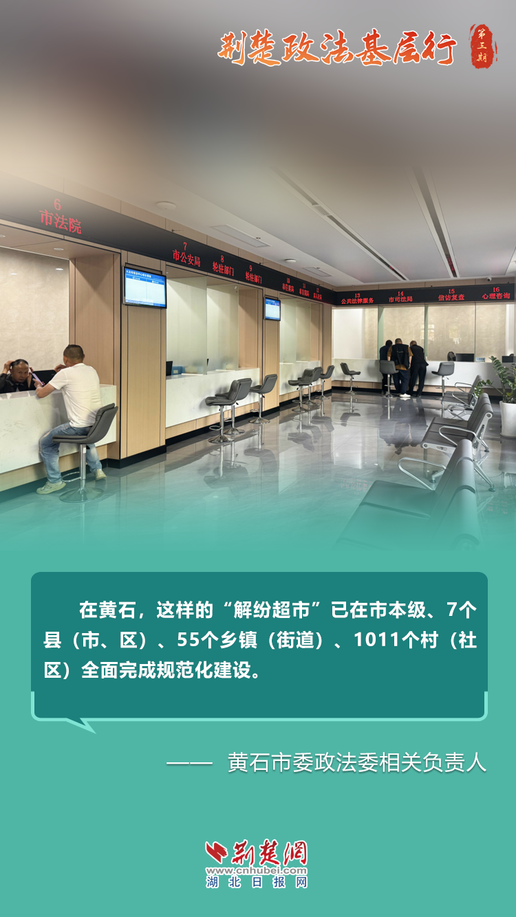 “在黃石,這樣的‘解紛超市’已在市本級、7個縣(市、區(qū))、55個鄉(xiāng)鎮(zhèn)(街道)、1011個村(社區(qū))全面完成規(guī)范化建設(shè)。”黃石市委政法委相關(guān)負責人說。
