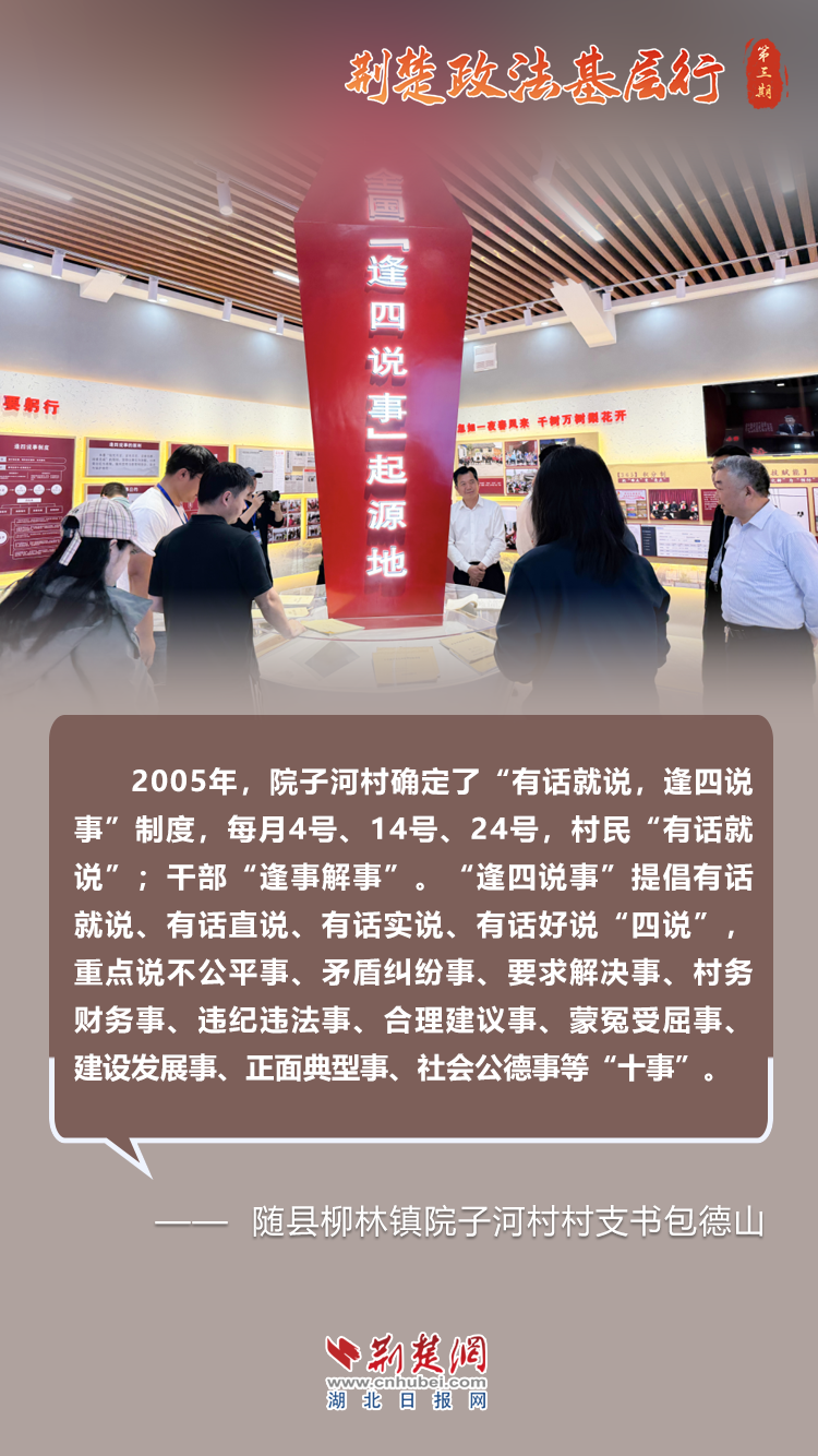 “每月4號、14號、24號,村民‘有話就說’;干部‘逢事解事’。”在隨州市隨縣院子河村,《民情記錄簿》記載了20年來200多起矛盾糾紛的調(diào)解臺賬。該村首創(chuàng)“逢四說事”制度已在十多個省市推廣,成為全國“逢四說事”的起源地。