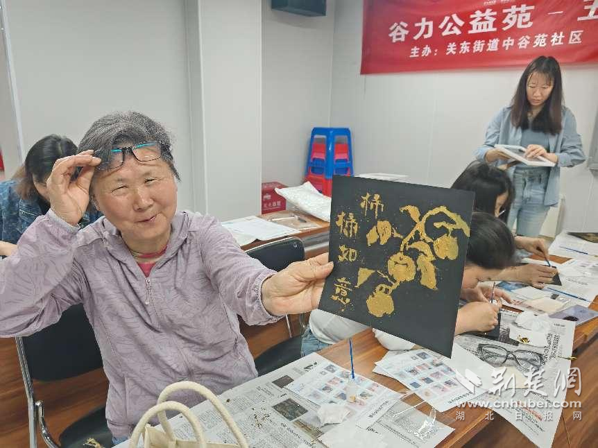 參與居民們熱情高漲,從青壯年到銀發(fā)長者均沉浸其中。社區(qū)李阿姨捧著自己完成的《柿柿如意》金箔畫欣喜表示:“沒想到在家門口就能學到這么精致的技藝,作品還能帶回家裝飾,特別有成就感!”