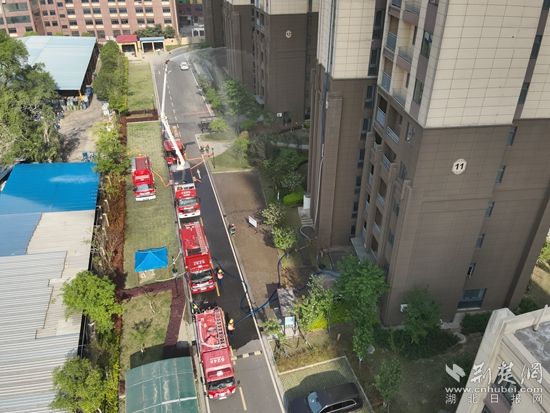 此次演練假設(shè)張家灣小區(qū)11棟19樓發(fā)生火災(zāi),火勢較大伴隨濃煙且迅速向上蔓延,并有人員被困,情況十分緊急。鄂州市葛店經(jīng)開區(qū)聚賢路消防站接到指揮中心報警后,立即啟動建筑火災(zāi)應(yīng)急預(yù)案,并調(diào)派救援力量趕赴現(xiàn)場處置。