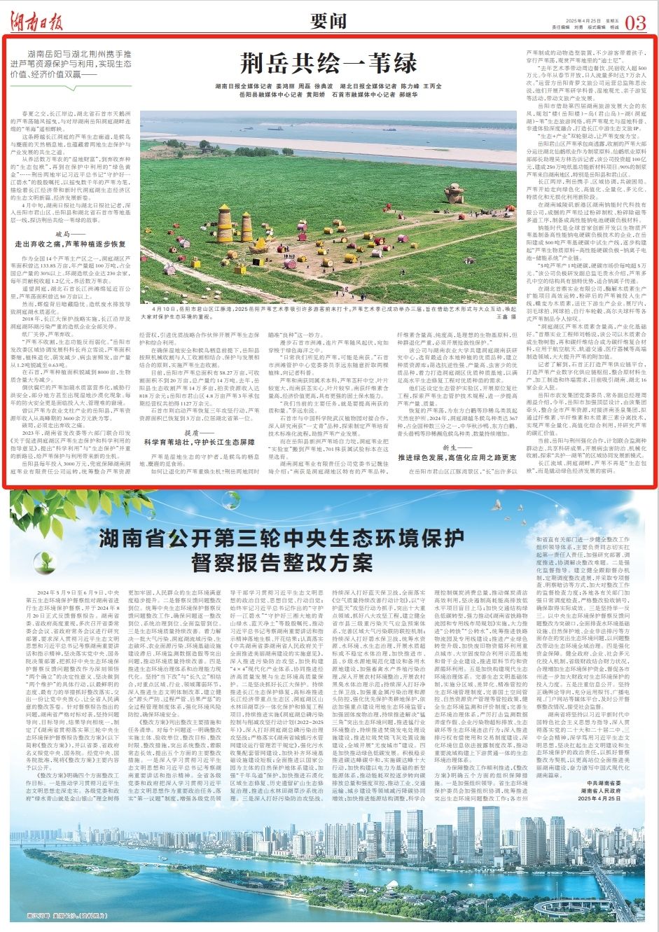 4月中旬,湖南日報社與湖北日報社記者,深入岳陽市君山區、岳陽縣和湖北省石首市等地基層一線,探訪荊岳共繪一葦綠的故事。