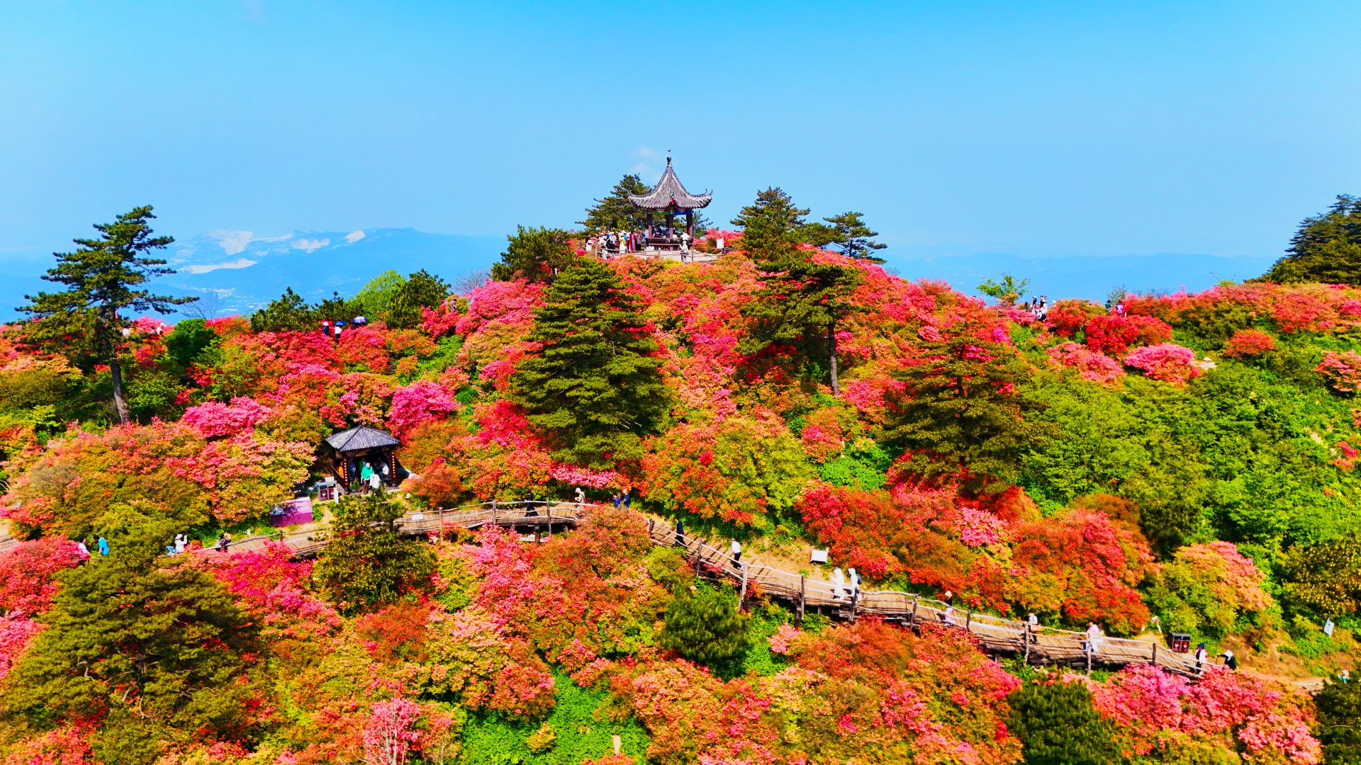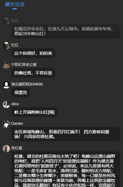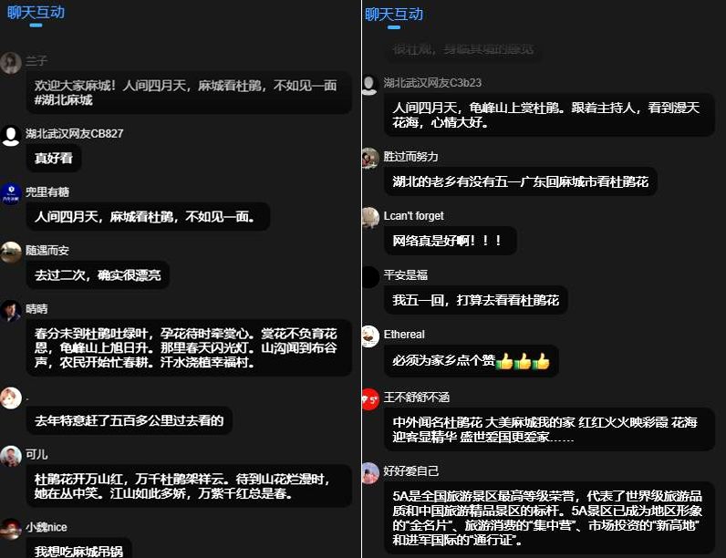 鏡頭中,龜山核心景點被紅粉交織的杜鵑 “紅霞” 全覆蓋,艷若丹霞的花瓣隨風輕顫,網友直呼“美到窒息”。這場直播吸引了超68萬人觀看,點贊數超萬人,彈幕區被“龜峰山杜鵑,100%值得一看,這才是真正的旅游圣地!”“五一必須去打卡”刷屏。主播和景區講解員阮導沿著花海二環線邊走邊聊,當鏡頭掃過“杜鵑花海一環線”時,航拍畫面下,花浪如紅色瀑布傾瀉山間,網友贊嘆:“這景色真的是太美啦!”還有不少外地網友線上作詩,表達對杜鵑花的贊美之情。