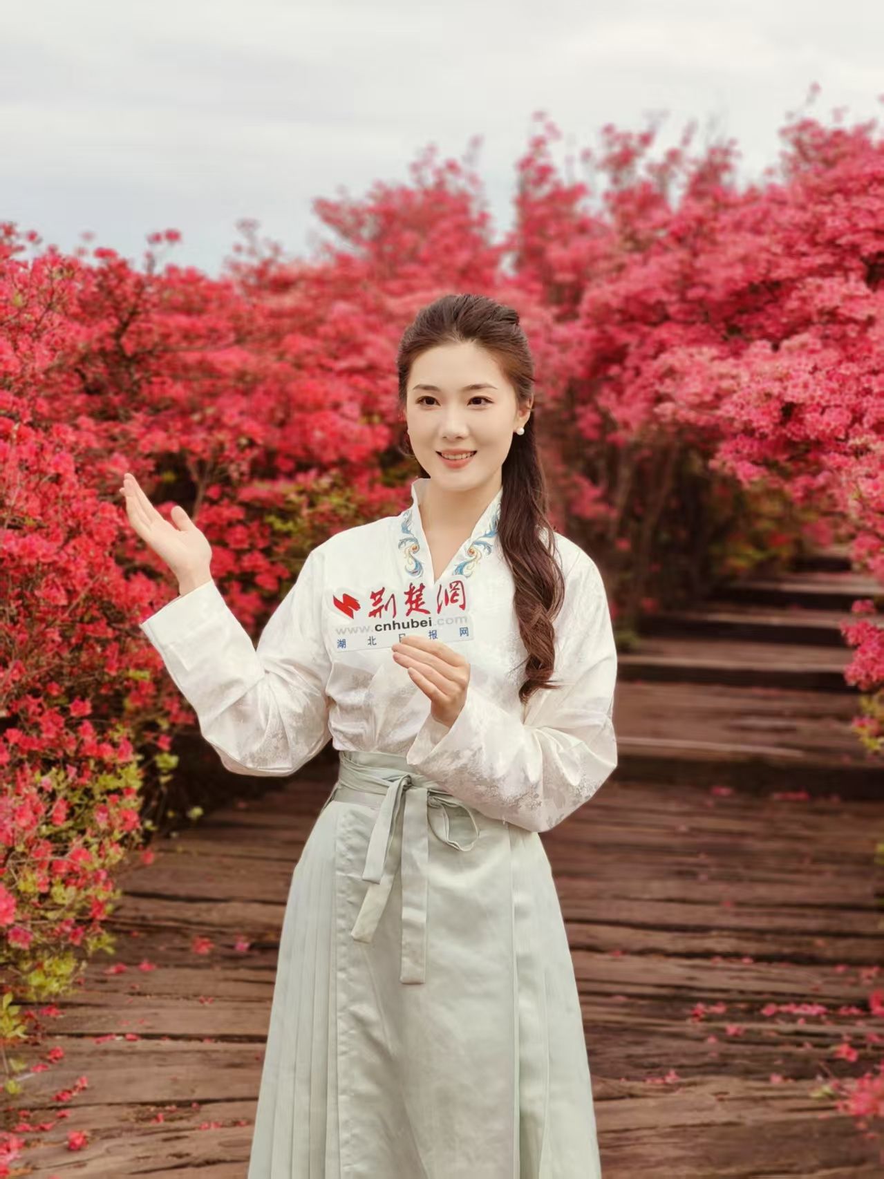 荊楚網(湖北日報網)訊(記者沈素芬 劉雄 通訊員尹杰 楊利)4月25日上午10點,麻城龜峰山的陽光像加了濾鏡的美顏燈,把萬畝杜鵑花海襯得格外透亮。美女主播小張身著美麗的漢服裙,帶網友“云游”龜峰山十萬畝杜鵑花海。