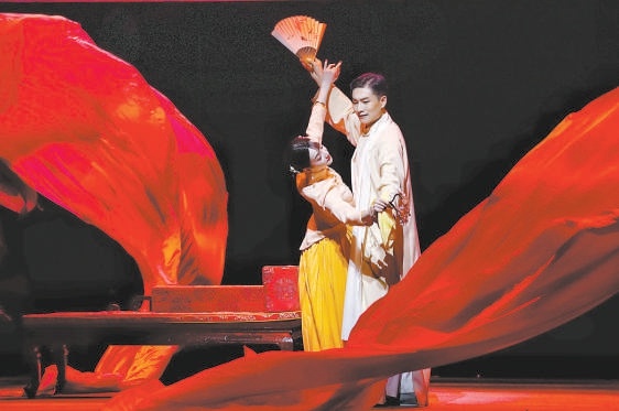 作為一名武生出身的昆曲演員,劉恒首次跨界話劇舞臺(tái),挑戰(zhàn)男旦角色,既要展現(xiàn)出眾的戲曲功底,又要克服多年的武生表演習(xí)慣,還要刻畫一代名伶的復(fù)雜境遇和情感糾葛,難度極大。他通過收斂武生的凌厲眼神,賦予角色文雅的書生氣質(zhì),同時(shí)以柔中帶剛的肢體語(yǔ)言,展現(xiàn)出名伶的脆弱與堅(jiān)韌,并將戲曲程式化動(dòng)作融入角色塑造。長(zhǎng)綢舞的飄逸、折扇開合的韻律,乃至云手轉(zhuǎn)身的停頓,都外化了魏蓮生的人物身份和情感世界。無(wú)論是魏蓮生的獨(dú)處,還是與玉春的感情戲,劉恒都以細(xì)膩的停頓和眼神流轉(zhuǎn),將角色豐富的情感層層遞進(jìn)。最后一場(chǎng)戲,有著舞蹈功底的陸璐扮演的玉春,和劉恒扮演的魏蓮生一大段唯美動(dòng)人的共舞,既有舞蹈的優(yōu)美,又有戲曲的雅致,共同塑造了“短暫卻燦爛”的愛情意象。
