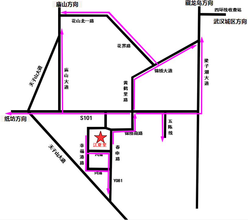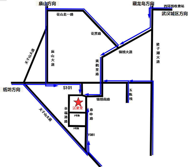 進出城通道主要是:文化大道、江夏大道、四環線梁子湖大道出入口、101省道、梁子湖大道。