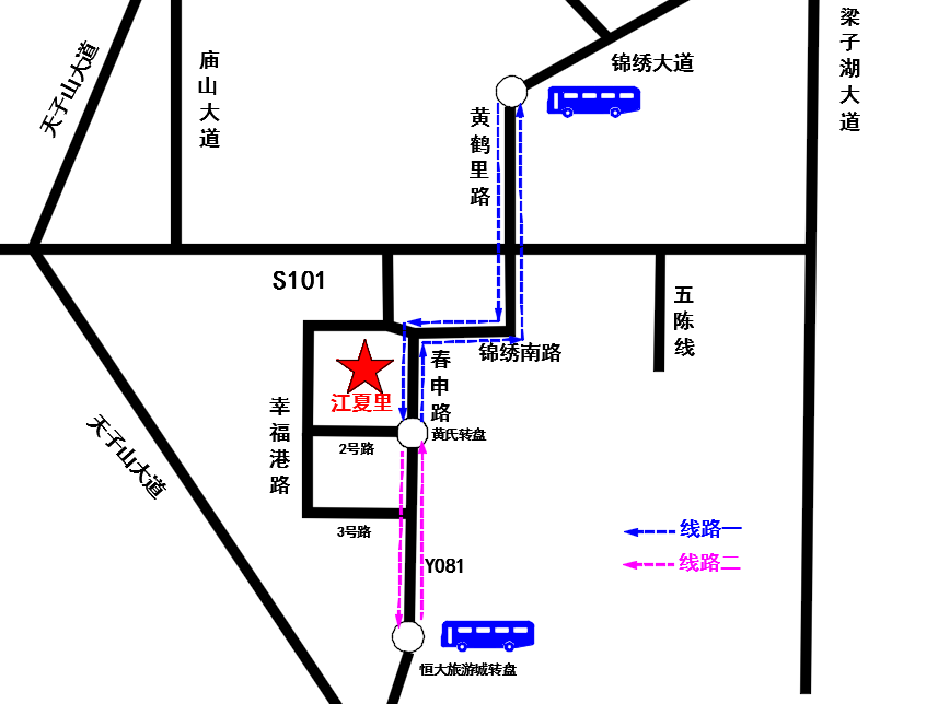 線路一:四環線梁子湖大道方向,梁子湖大道→錦繡大道→黃鶴里路→錦繡南路→春申路→2、3號停車場