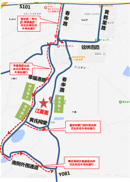 (4)“江夏里”景區南側外圍通道由西往東機動車單向通行;