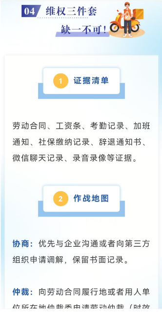 那怎么證明這些事兒呢?寶典貼心準備了維權三件套,列了一堆證據清單,像勞動合同、工資條、考勤記錄、加班通知、社保繳納記錄、辭退通知書,還有微信聊天記錄、錄音錄像等等,提醒騎手們把這些東西都保存好,萬一要用時,可不能手忙腳亂找不到。