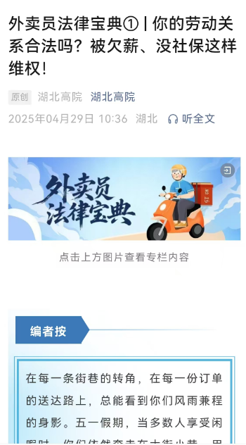 荊楚網(湖北日報網)訊(記者張揚,通訊員陸明、蔡蕾)京東入局,擂臺打響,外賣騎手權益保障引發全網關注。4月29日,五一國際勞動節前夕,湖北省高級人民法院給外賣小哥送來了一份超貼心的禮物——“外賣員法律寶典”,專門給外賣小哥們支招,教他們合法維護自己的權益。