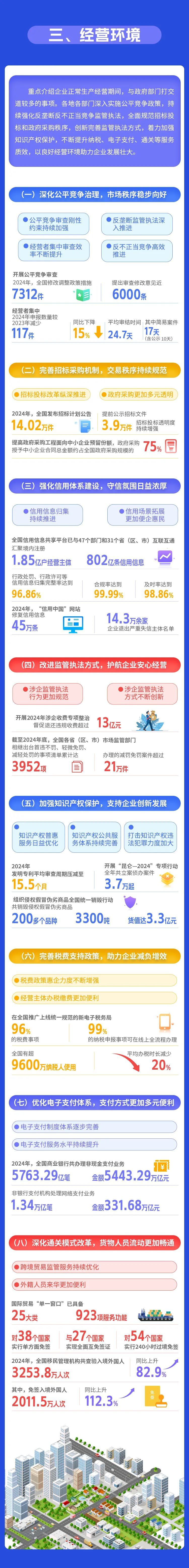 《報告》緊扣企業關切,以經營主體獲得感為導向,聚焦破除準入壁壘、保障公平競爭、規范監管執法、保護知識產權等突出關切,介紹2024年相關領域出臺的法律法規或政策文件、貫徹落實的具體舉措、取得的實際成效,輔以11個政策專欄、16個地方案例生動呈現改革實施效果。