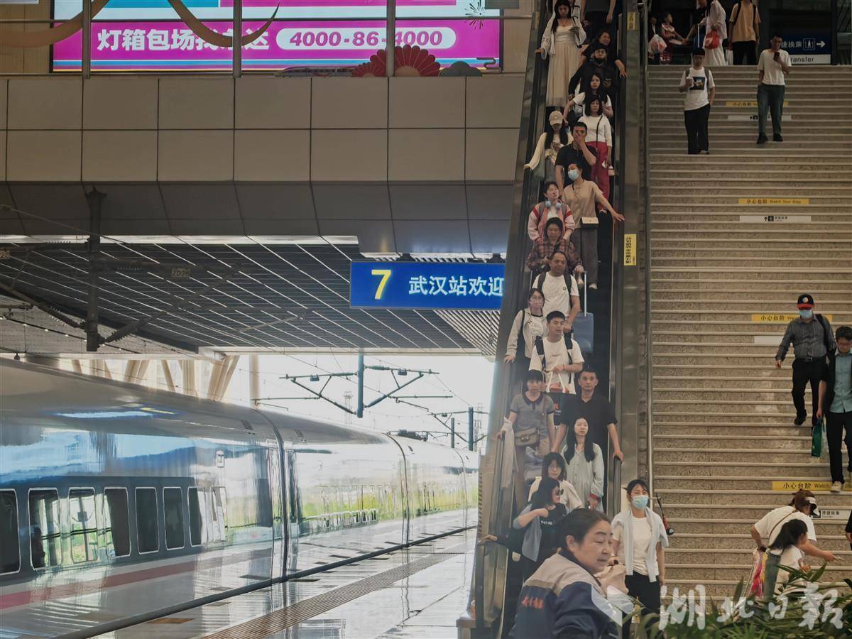 “五一”期間,武漢火車站客流升至日??土鞯?倍。其中,5月1日,進出武漢火車站的客流更是合計達到33.5萬人次,刷新歷史記錄。高峰時段,平均1.5分鐘開出一趟列車。