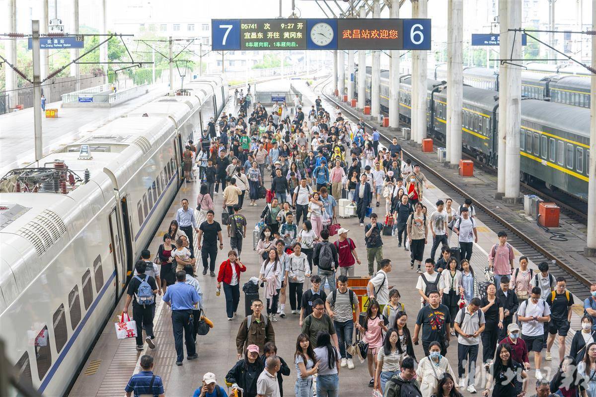 5月4日,武昌火車站,旅客們有序進站乘車、到達出站。當日是“五一”假期第四天,武漢鐵路迎來假期返程高峰。武昌站預計發送到達旅客約15萬人次。武鐵青年民警堅守崗位弘揚“五四”精神,保障假期鐵路運輸安全穩定。為確保武漢、武昌、漢口等火車站大客流下進站乘車秩序有序,各客運所執勤民警強化重點時段、區段巡邏值守,切實提高震懾力和管事率,及時回應旅客求助,協助做好客流疏導、服務保障等工作,同時在站臺增派警力,有序引導和幫扶旅客上下車。