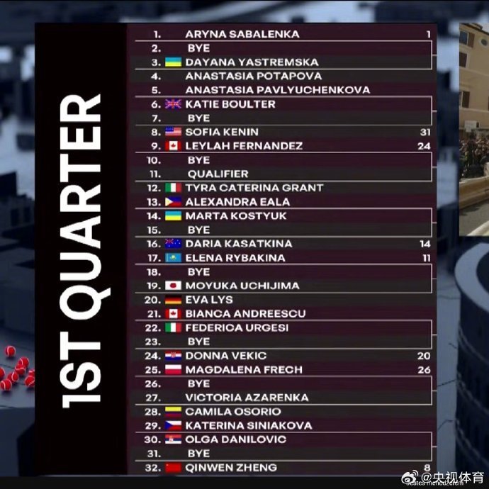 WTA羅馬1000賽公布女單正賽簽表,8號種子鄭欽文再次和頭號種子薩巴倫卡進入1/4區。首輪鄭欽文輪空,次輪將面對斯尼亞科娃和達尼洛維奇的勝者。