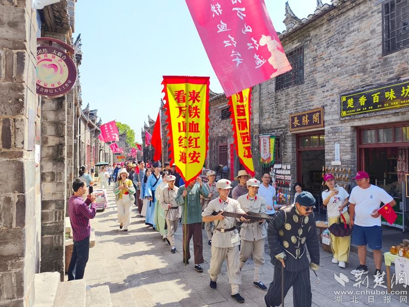 與此同時,大型紅色實景劇《紅安永遠紅》劇組的巡街展演活動也是一大亮點。演員們扮演成紅軍戰士押著地主惡霸,高呼著勝利的口號穿街而過,不少游客爭相與演員互動并拍照留念。據出品方將軍紅四方景區介紹,五一期間,《紅安永遠紅》增開夜間場次,以滿足游客觀看需求。