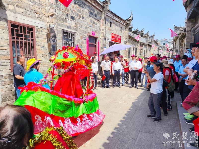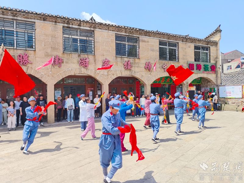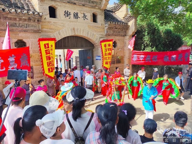 民俗文化展演也為長勝街紅色旅游活動增添了不少活力。該鎮在重大節日推出舞龍舞獅,玩花燈等民俗活動,讓紅色旅游活起來。“我們縣文旅局組織了社會文藝團體,為游客準備了精彩的傳統文藝節目,比如蓮香舞、采蓮船、蚌蚌精、牌子鑼鼓等?!笨h文化館館長薛立花介紹。五一期間演出團隊每天沿北門廣場,穿過長勝街至紅安大布傳習所,全天候進行表演。