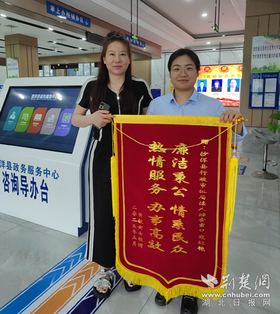 荊楚網(湖北日報網)訊(張佩娟 寇紅艷)“太感謝你們了!要不是你們周到服務,這證不知道辦到什么時候!”5月8日,黃敏女士將一面印著“廉潔秉公情系民眾 熱情服務辦事高效”的錦旗,送到沙洋縣政務服務中心法人綜合窗口工作人員寇紅艷手中,致謝其在辦理娛樂經營許可證時的高效服務。