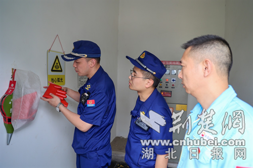 消防監督員對加油站場所配電室進行檢查。通訊員供圖