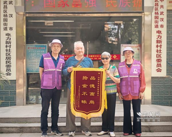 荊楚網(湖北日報網)訊(通訊員 楊帆 張芳蕾 侯本瑞)“住在咱們社區,真是安全感滿滿!”5月12日下午,武昌區楊園街道電力新村社區居民曹師傅將一面繡有“拾金不昧 品德高尚”的錦旗交到社區義務巡邏隊員詹海桃、張克信手中。
