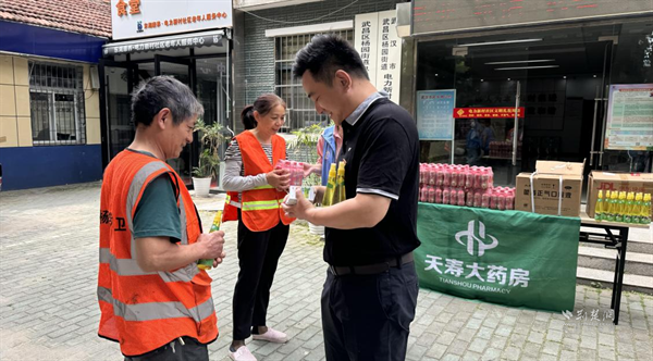 荊楚網(湖北日報網)訊(通訊員 張芳蕾)立夏已至,暑意漸濃。為切實做好高溫天氣防暑降溫工作,5月14日上午,武昌區楊園街道電力新村社區攜手轄區共建單位天壽大藥房開展“夏日送清涼”慰問活動,為堅守崗位的環衛工人及社區義務巡邏隊員送上精心準備的“清涼大禮包”,在炎炎夏日傳遞關懷與敬意。