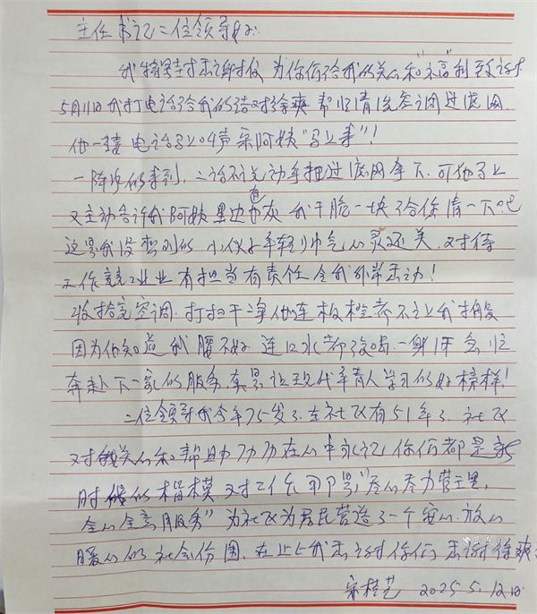 荊楚網(湖北日報網)訊(通訊員 蘇珺顥 侯本瑞)“多虧了徐師傅,這個夏天能安心過了!”5月12日,武昌區楊園街道電信社區居民宋師傅將一封親筆致謝信送到社區居委會。信中,宋師傅對“輕騎哨”志愿者贊不絕口,折射出社區“以新助老”結對幫扶行動的暖心成效。