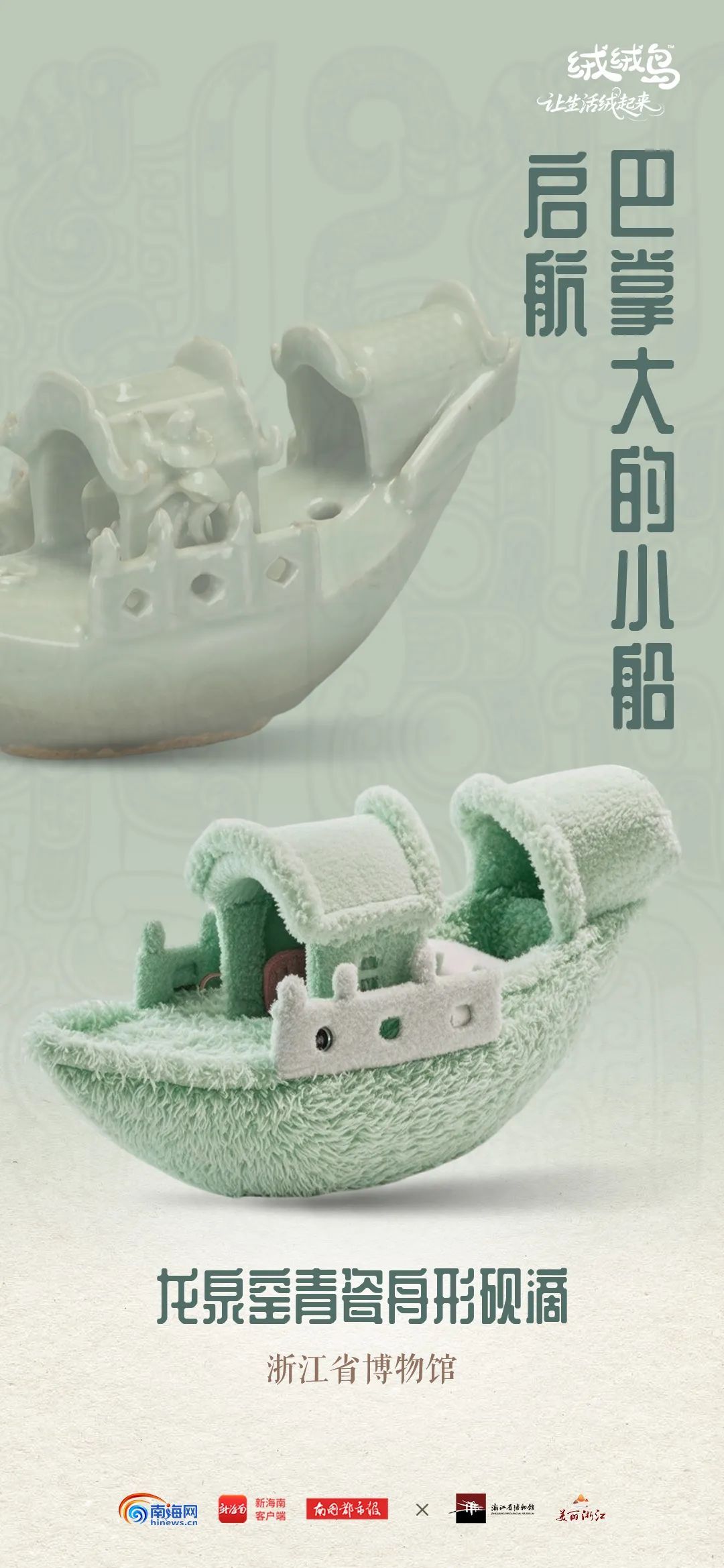 龍泉窯青瓷舟形硯滴小巧玲瓏,尺寸接近一個成年人的手掌大小,其胎質細膩潔白,通體施溫潤肥厚的粉青色釉,仿佛自帶“煙雨江南”的氣質。硯滴的造型,被做成了一艘漂在水面上的扁舟,舟上艙篷、艄(shāo,船尾)篷、欄板一應俱全,雕刻精細,栩栩如生。