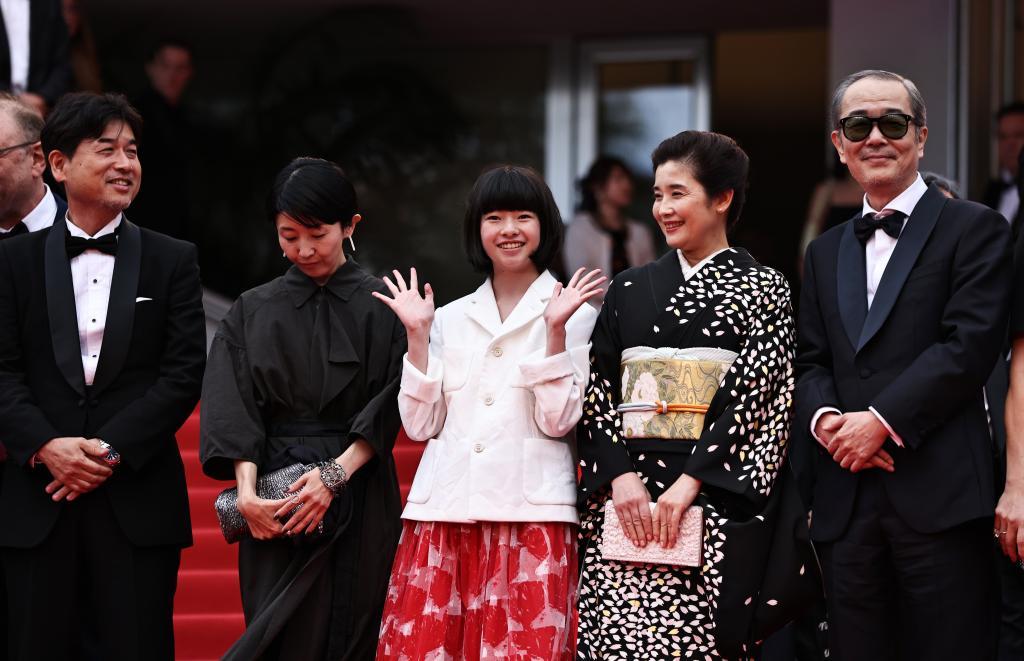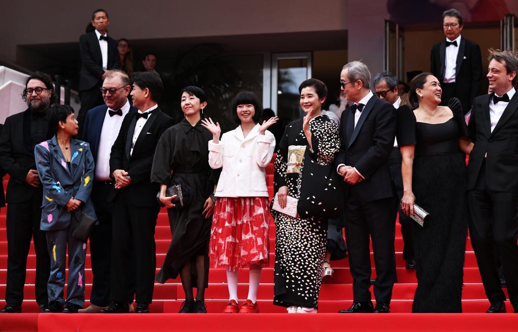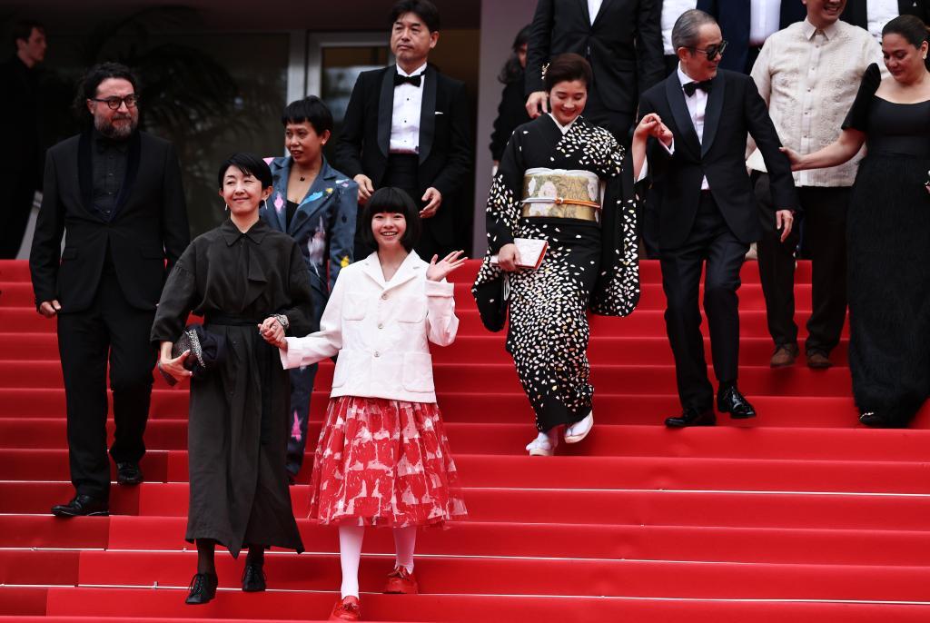 5月17日,在法國戛納舉行的第78屆戛納國際電影節(jié)上,主競賽單元影片《雷諾阿》主創(chuàng)人員在影片首映后走出電影宮。新華社記者 高靜 攝