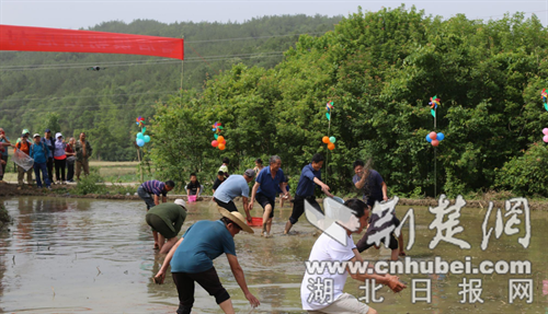 稻田化身“趣味競(jìng)技場(chǎng)”:100斤鯽魚(yú)投放形成“渾水摸魚(yú)”戰(zhàn)場(chǎng),參與者赤足下水競(jìng)逐收獲;網(wǎng)紅與村民組隊(duì)拔河,吶喊聲激蕩田園。最具專(zhuān)業(yè)性的插秧比賽中,“淺直勻齊”的標(biāo)準(zhǔn)示范與農(nóng)耕舞蹈暖場(chǎng)后,參賽者俯身插苗如“五線(xiàn)譜”落田,最終6名優(yōu)勝者獲贈(zèng)蜂蜜、葛粉等本土農(nóng)產(chǎn),實(shí)現(xiàn)技藝競(jìng)技與產(chǎn)品推廣的雙向賦能。