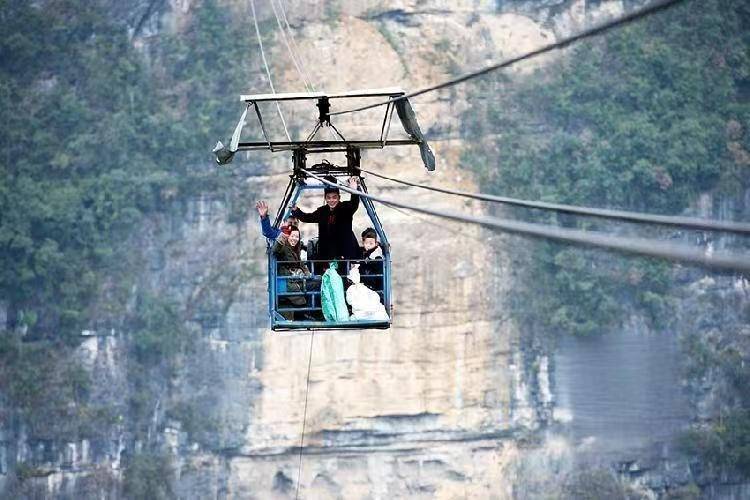 (圖為:漁山村村民坐上距離谷底500多米的懸索出山)