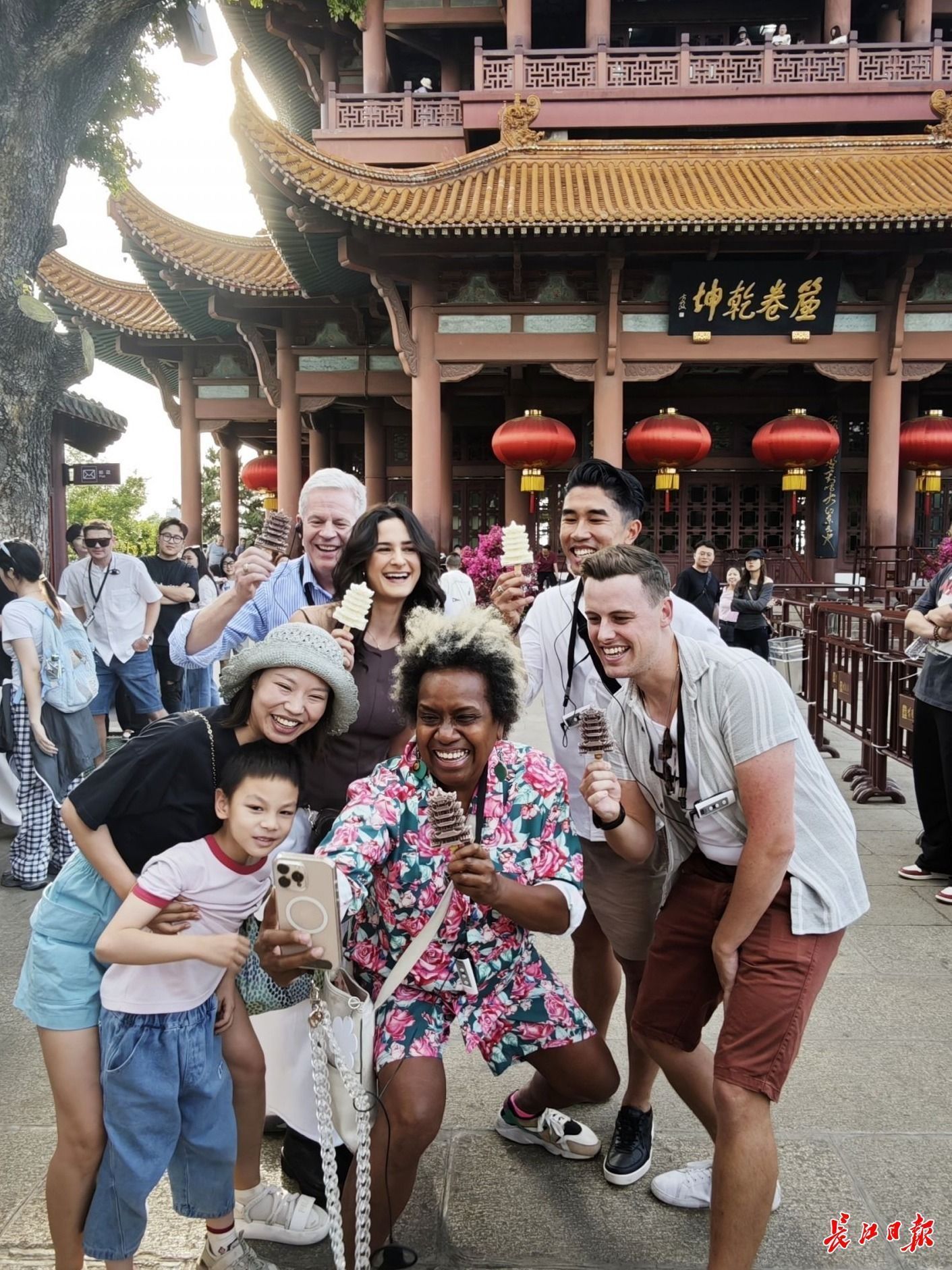 外國游客手握黃鶴樓文創雪糕合影。記者何曉剛 攝